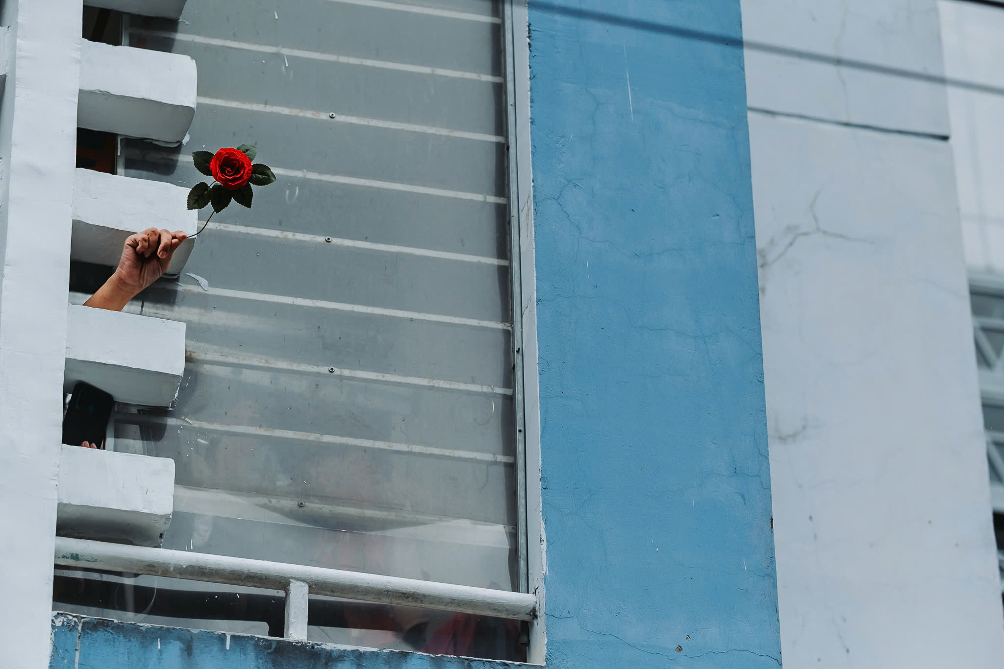 Bệnh nhân cảm ơn y bác sĩ bằng cành hoa hồng từ chung cư - Ảnh: NGUYỄN HIỀN