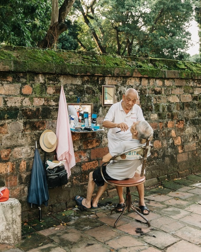 Cảnh hớt tóc bên ngoài Văn Miếu, Hà Nội.