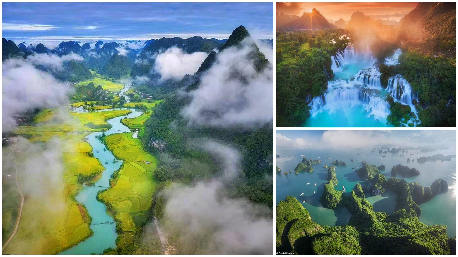Những bức ảnh chụp từ trên không của Daniel Kordan cho thấy vẻ đẹp khác lạ của sông Quây Sơn và thác Bản Giốc (nằm giữa biên giới Việt Nam - Trung Quốc, ở huyện Trùng Khánh, tỉnh Cao Bằng, Việt Nam) và vịnh Hạ Long. Ảnh: Daniel Kordan